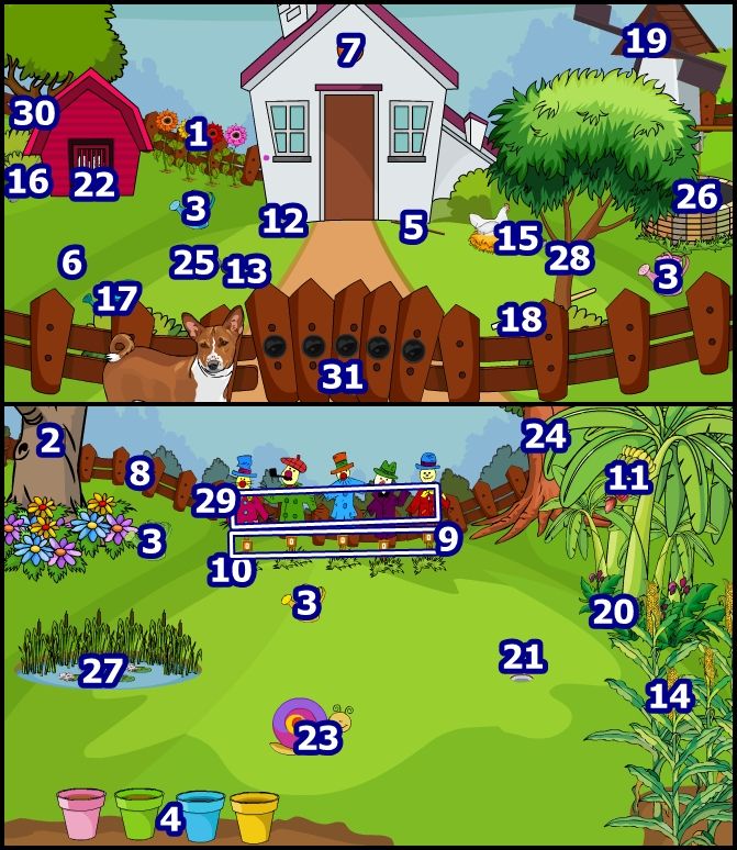 21. Usa el huevo y el palo de golf; luego la pala y recolecta las 4 semillas. Usa luego la regadera y toma la FLOR 5/5.